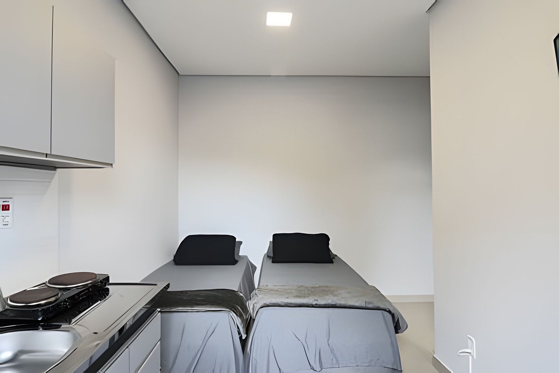 Studio completo com tudo que você precisa para uma estadia confortável e prática: cama, cozinha equipada, TV, frigobar e mesa de trabalho. Esta unidade conta com duas camas de solteiro.