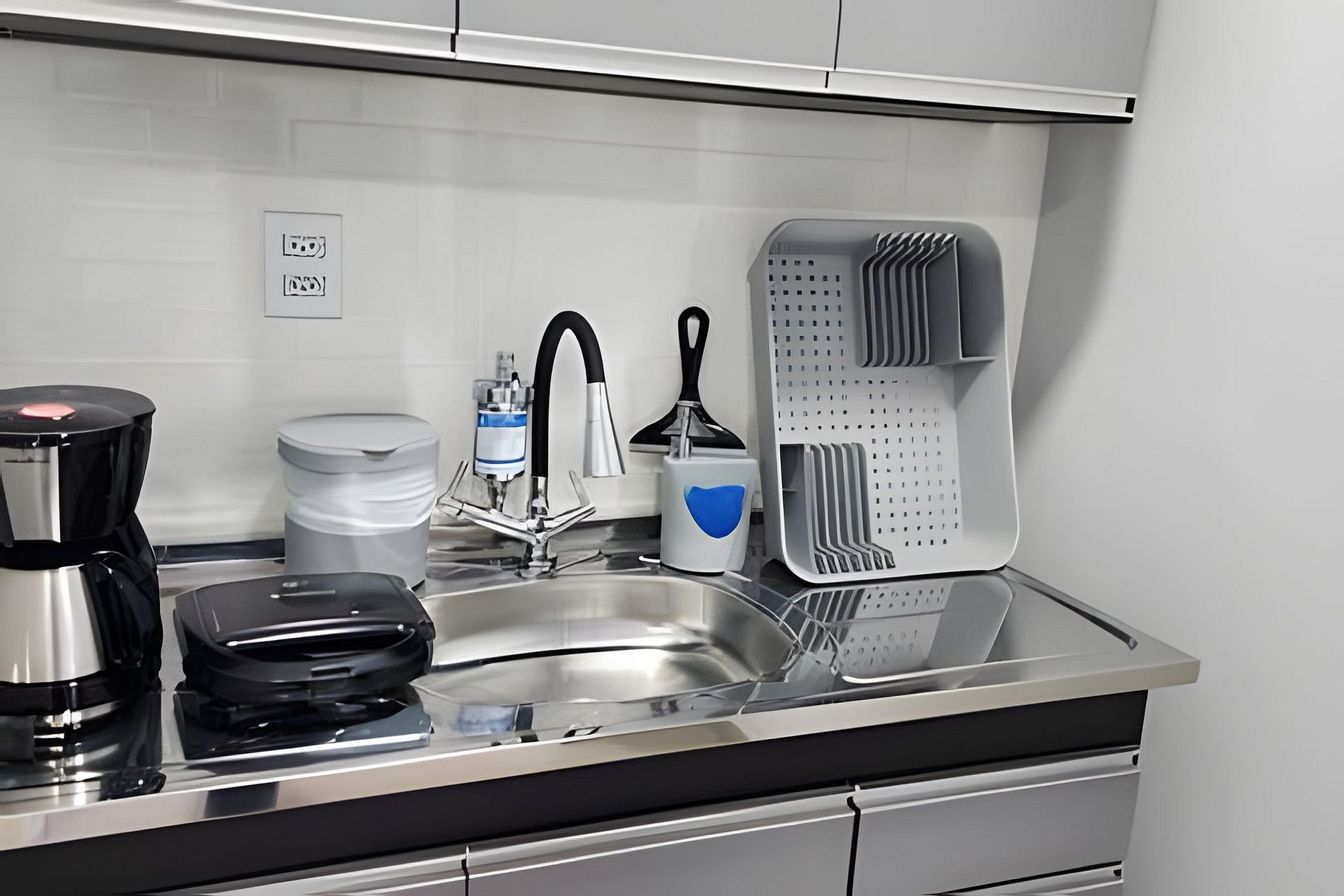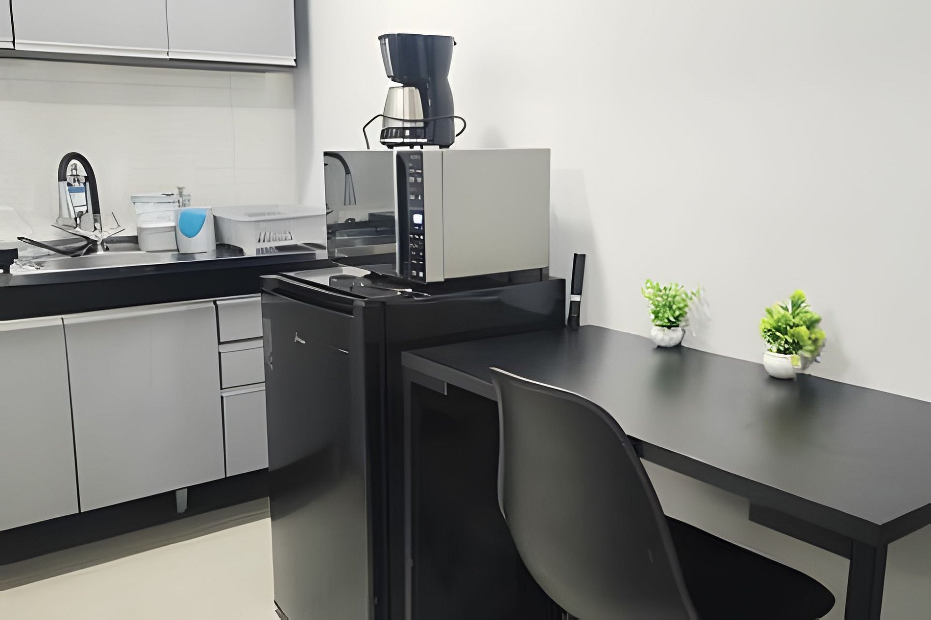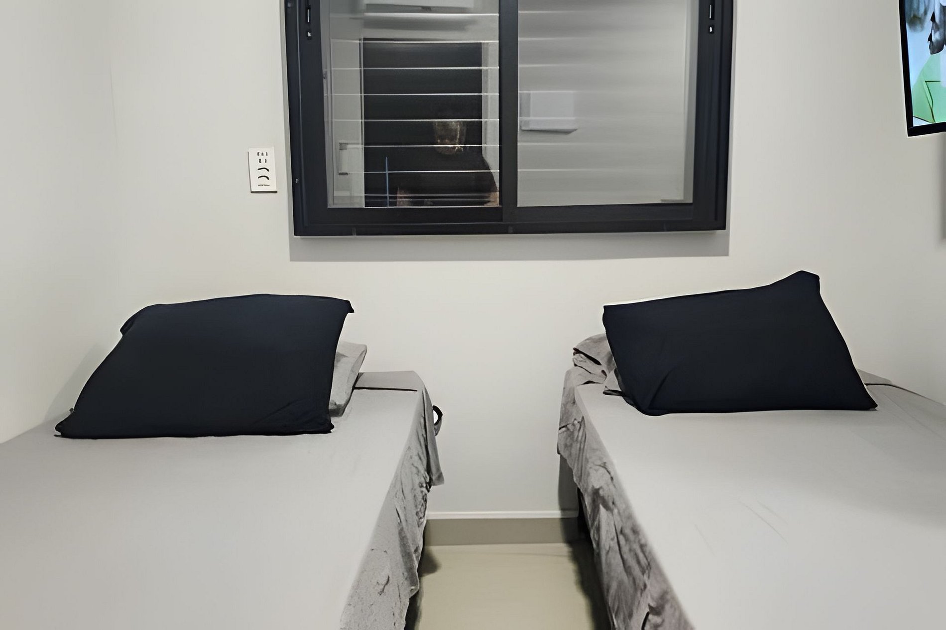 Studio Completo. Tudo o que é necessário para uma estadia confortável e funcional. Cama, Cozinha com utensílios, TV, Frigobar e Ar Condicionado e Mesa de Trabalho. Essa unidade possui duas camas de solteiro.