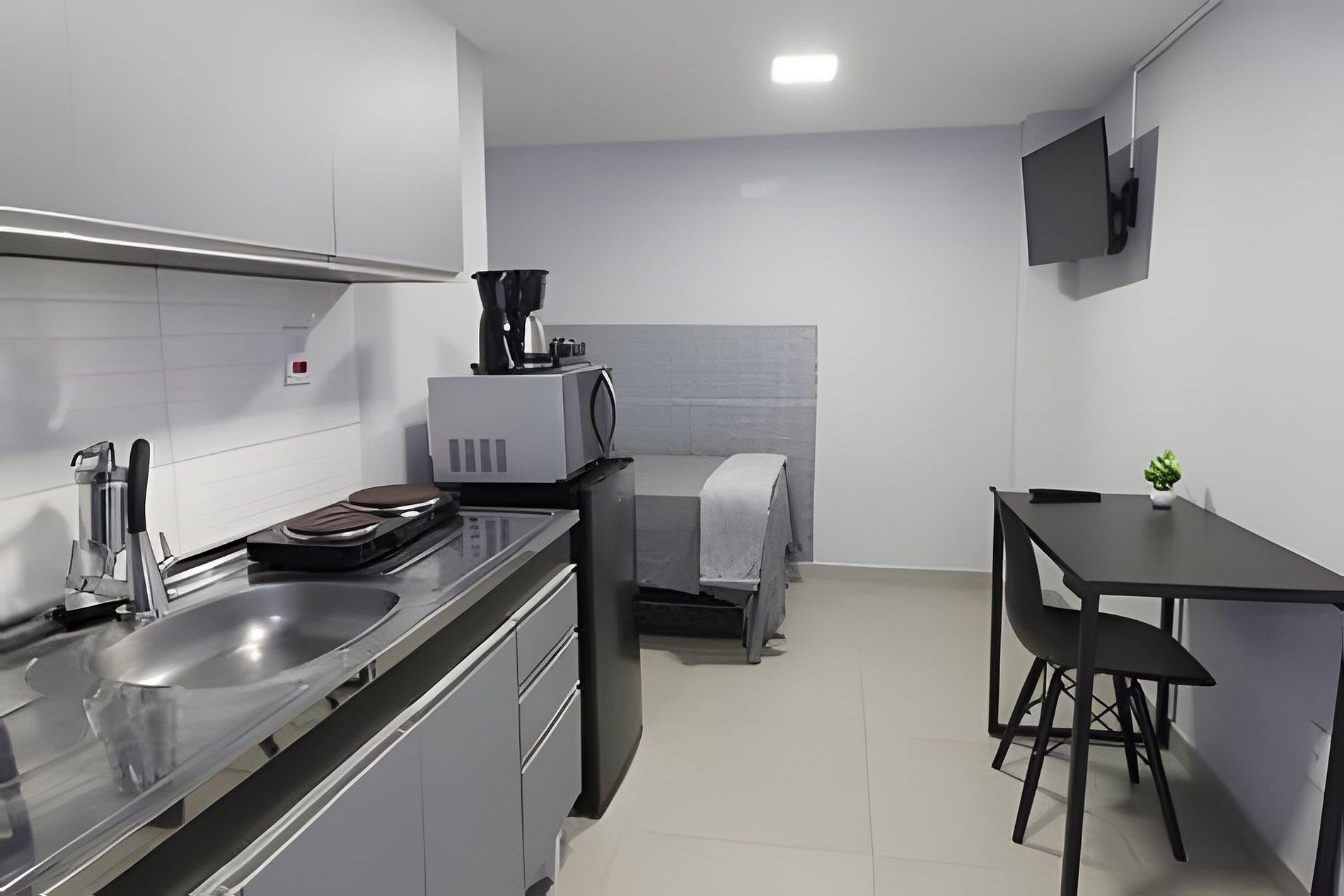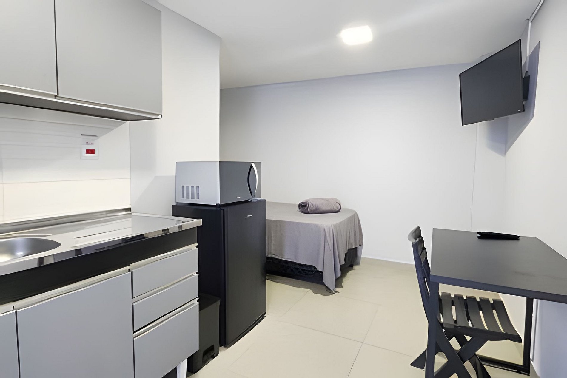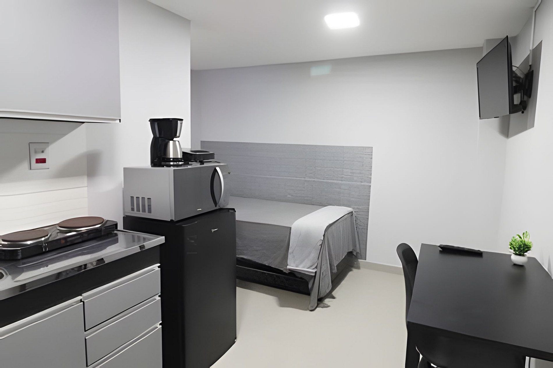 Studio Completo com tudo o que é necessário para uma estadia funcional e confortável. Com ar condicionado, cozinha e banheiros privativos. Possui uma cama de solteiro.