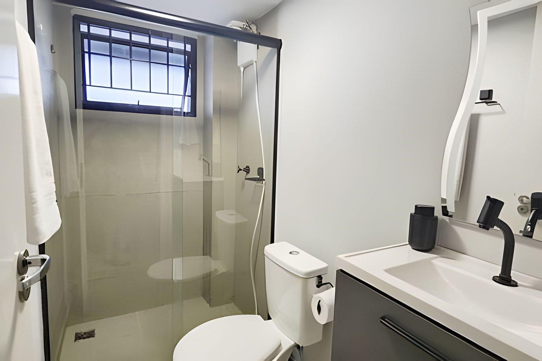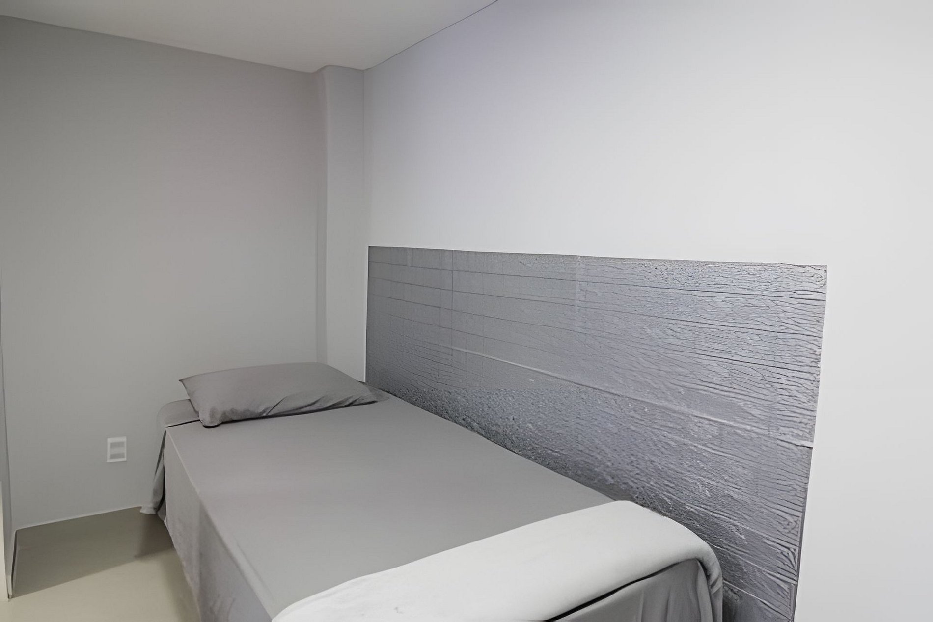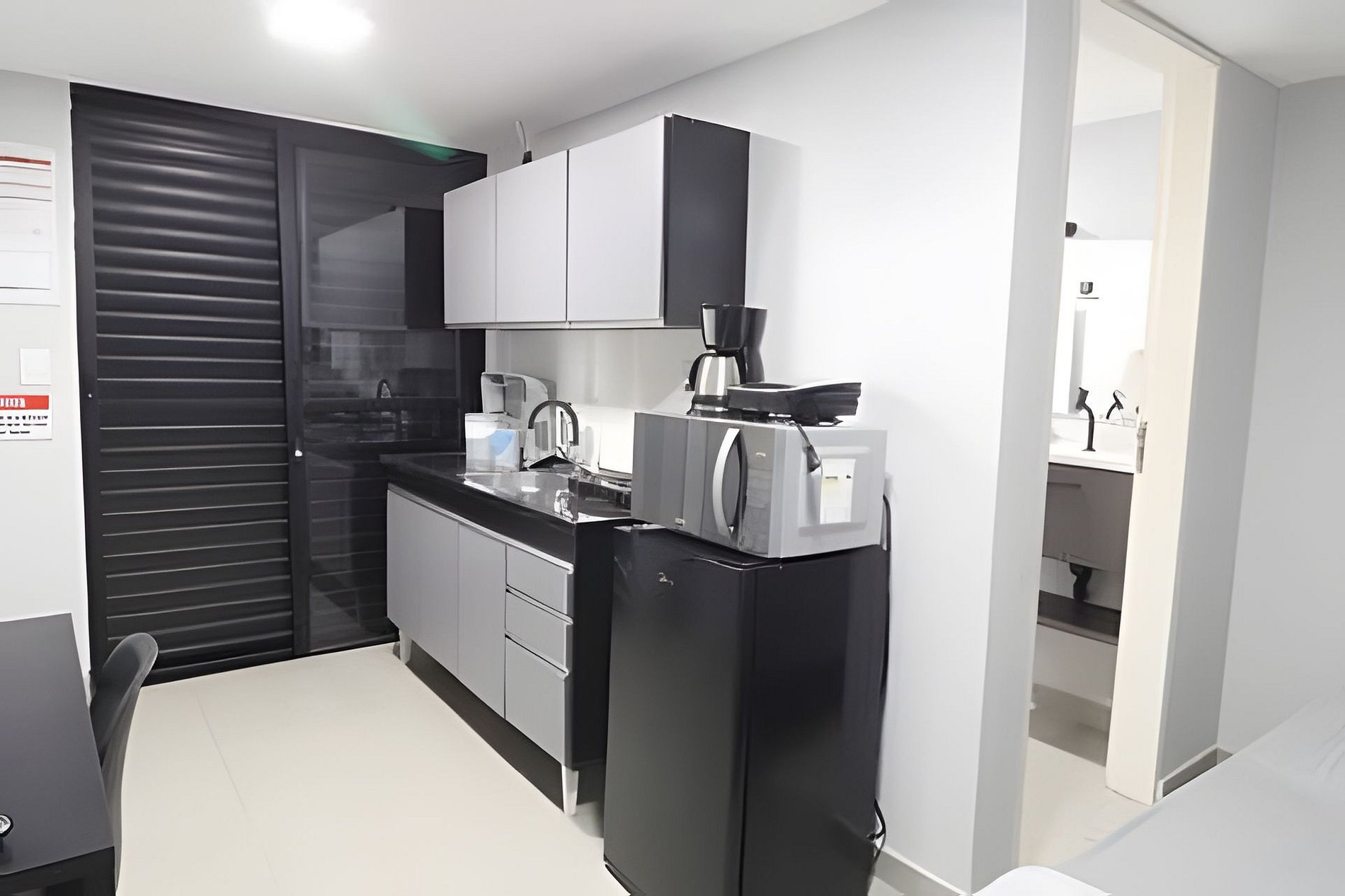 Studio Completo com tudo o que é necessário para uma estadia funcional e confortável. Com ar condicionado, cozinha e banheiros privativos. Possui uma cama de solteiro.